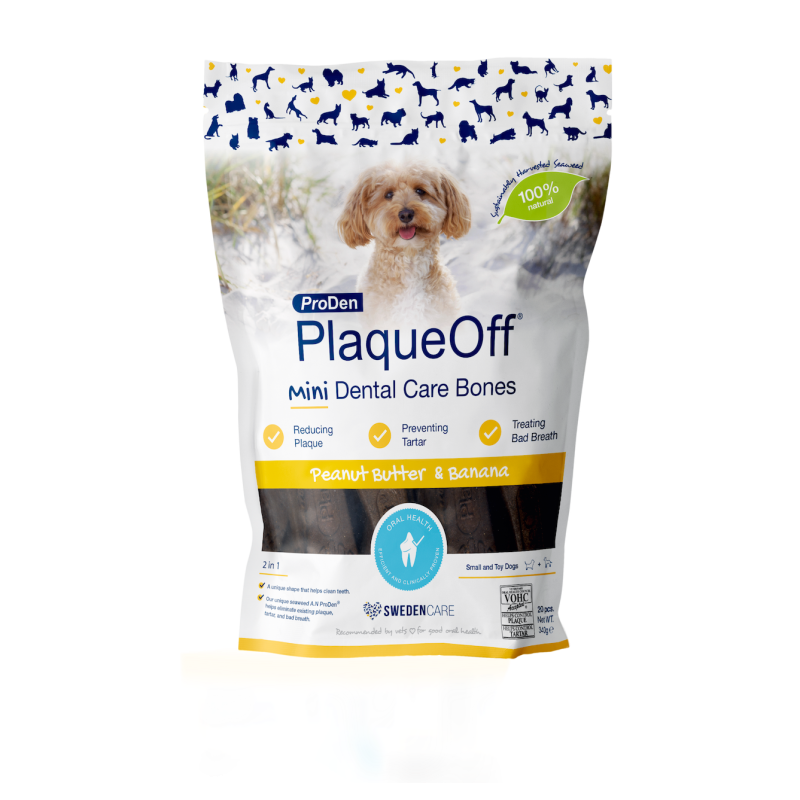 Mε μοναδική γεύση φυστικοβούτυρο & μπανάνα, τα PlaqueOff® Mini Dental Care Bones είναι ιδιαίτερα γευστικά και αποδεκτά από τους σκύλους.