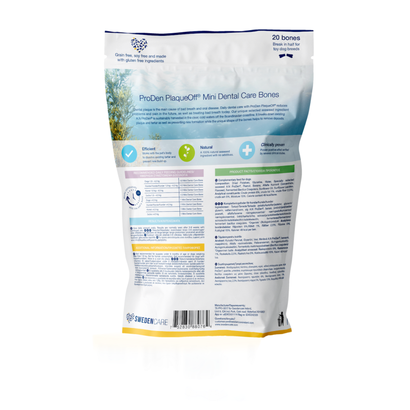 Τα ProDen PlaqueOff® Mini Dental Care Bones είναι λιχουδιές μασήματος σχεδιασμένες για μικρόσωμες φυλές σκύλων και περιέχουν το 100% φυσικό και κλινικά ελεγμένο φύκι A.N ProDen®. Τα Mini Bones καταπολεμούν τα στοματικά προβλήματα με διπλή δράση, το A.N ProDen® και το μοναδικό σχήμα των λιχουδιών με την μηχανική του δράση βοηθούν στον έλεγχο και τη βελτίωση της υπάρχουσας πλάκας και της πέτρας, προσφέροντας πιο δροσερή αναπνοή.