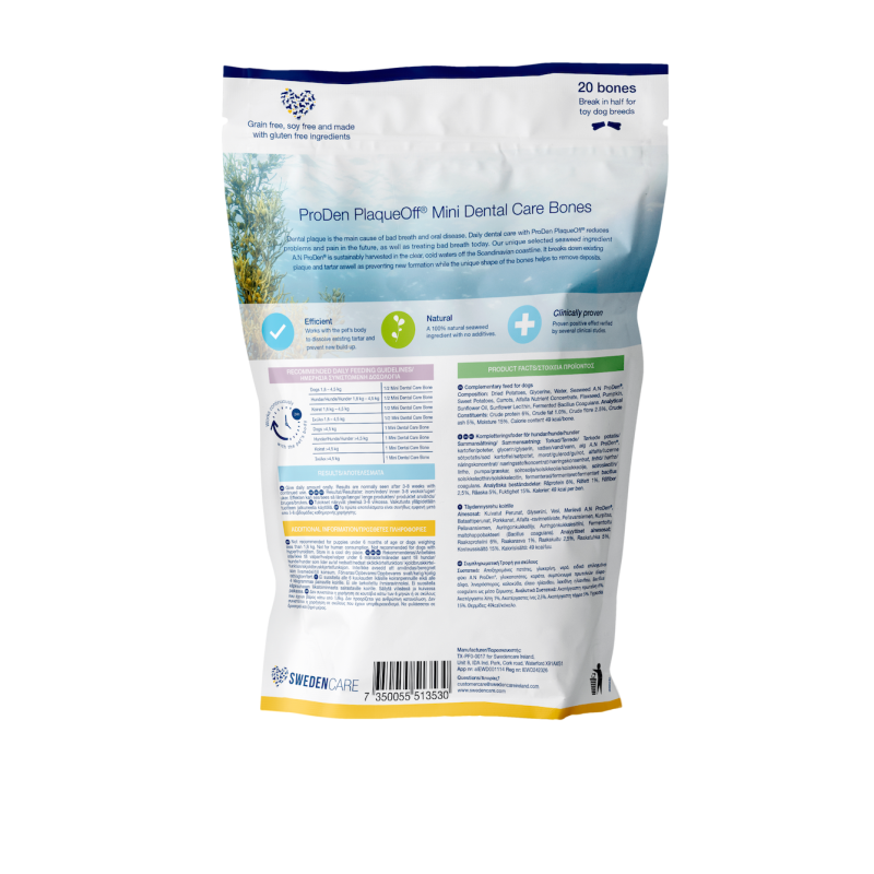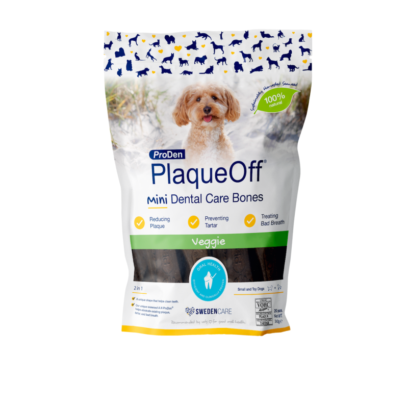Τα ProDen PlaqueOff® Mini Dental Care Bones είναι λιχουδιές μασήματος σχεδιασμένες για μικρόσωμες φυλές σκύλων και περιέχουν το 100% φυσικό και κλινικά ελεγμένο φύκι A.N ProDen®. Τα Mini Bones καταπολεμούν τα στοματικά προβλήματα με διπλή δράση, το A.N ProDen® και το μοναδικό σχήμα των λιχουδιών με την μηχανική του δράση βοηθούν στον έλεγχο και τη βελτίωση της υπάρχουσας πλάκας και της πέτρας, προσφέροντας πιο δροσερή αναπνοή.