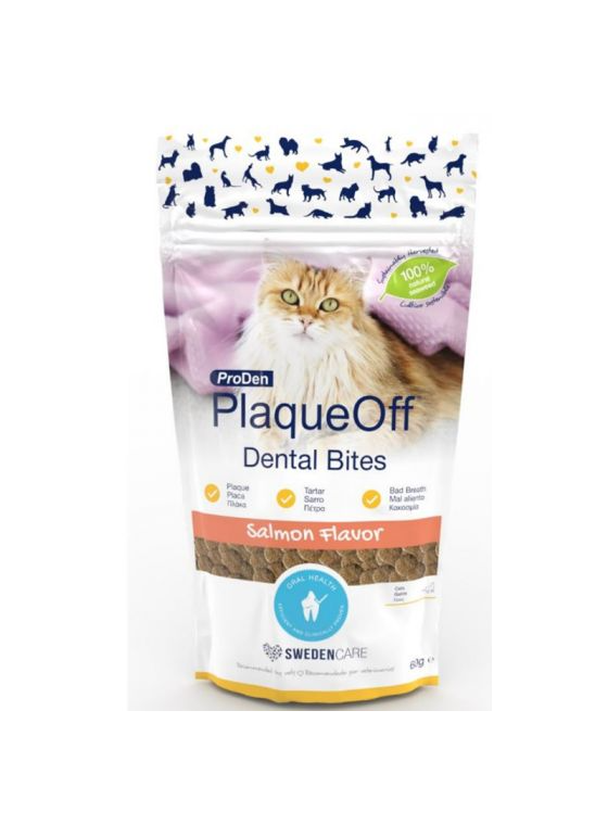 Οι ProDen PlaqueOff® Dental Bites είναι ένα φυσικό συμπλήρωμα διατροφής, ιδανικό για τη την φροντίδα της στοματικής υγιεινής της γάτας. Είναι ειδικά σχεδιασμένες σε μορφή κροκέτας για γάτες, με μοναδική γεύση σολομού. Περιέχουν το 100% φυσικό και κλινικά ελεγμένο φύκι A.N ProDen® και βοηθούν αποτελεσματικά στον έλεγχο και τη βελτίωση της υπάρχουσας πλάκας και της πέτρας, προσφέροντας πιο δροσερή αναπνοή