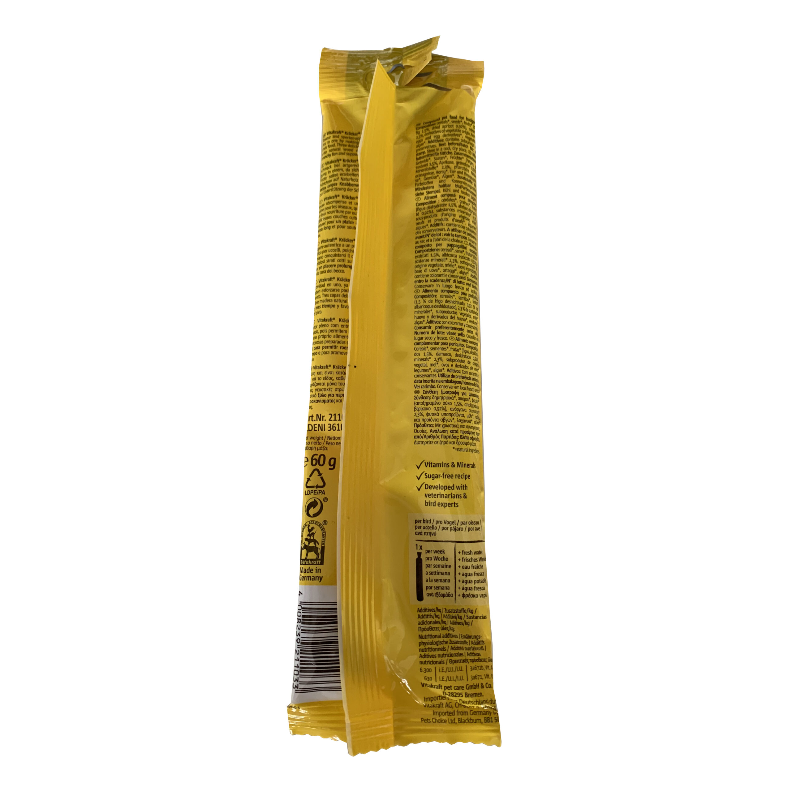Τραγανά Kracker προσαρμοσμένα στις ανάγκες που έχουν τα παπαγαλάκια. Φρουτώδης εμπειρία με μοναδική διαδικασία παραγωγής. Kracker 3 φορές ψημένα, με φυσικό ξύλινο στικάκι και κλιπ για να κρεμιέται στο κλουβί. Προσφέρουν καλή υγεία και καταπολέμηση της αδράνειας. Με πρωτεΐνες και ουσιώδεις βιταμίνες για ένα υγιές παπαγαλάκι! Δεν περιέχει πρόσθετα χρώματα ή ενισχυτικά γεύσης. Χωρίς συντηρητικά, ζάχαρη και χωρίς πρόσθετα αντιοξειδωτικά.